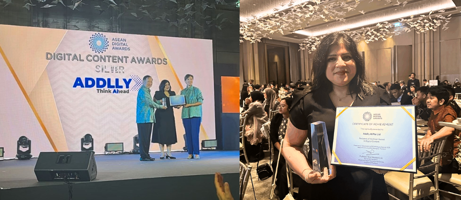 The results speak volumes: in under two years, Addlly AI has onboarded 20+ clients, earned the IMDA Spark accreditation, and won two ASEAN Digital Awards, including Silver in the Digital Content category.