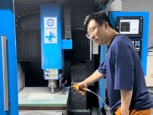 Jiahao in China, clearing manufacturing debris off a prototype with an air jet